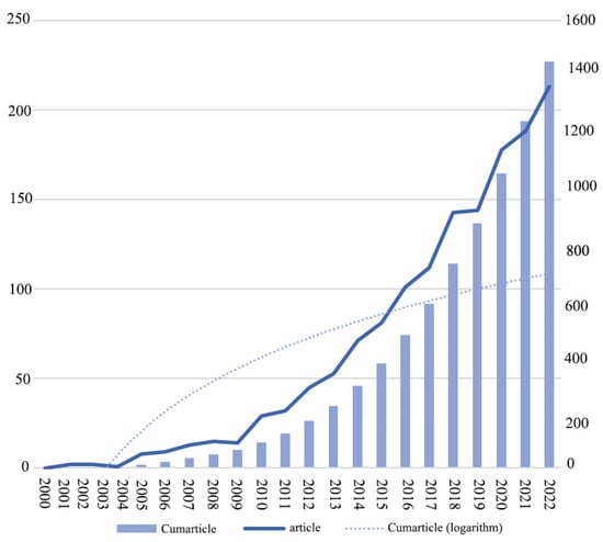 Number of published articles on vertical green systems from 2000 to 2022. The figure indicates the year-to-year values (vertical light-blue bar), the cumulative number (dark-blue line), and the logarithmic value of the cumulative number (blue dotted line).