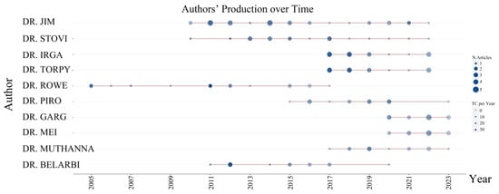 Deeper penetration into scholarly publications reveals the intersection of skyrise greenery and ecosystem services, facilitating the identification of pioneering authors in this research domain. Professor Jim published the greatest number of authored publications, while Professor Rowe had both the longest and the earliest history of publications. Four authors, Professors Irga, Torpy, Garg, and Mei, published the most recent volume of articles. The chronology of published investigations in the field (Figure 2) earmarks professor Rowe as an early adopter, immersing himself into this research domain as early as 2005, with particular emphasis on green roofs. Nevertheless, the scholarly interest and academic endeavors revolving around skyrise greenery and ecosystem services witnessed a considerable surge post-2015, indicating an emergent trend in applying skyrise greenery across expansive urban terrains.
