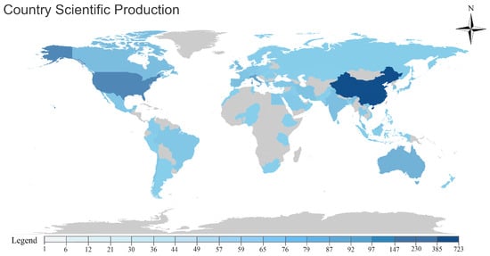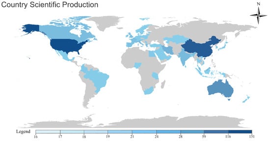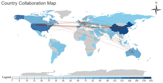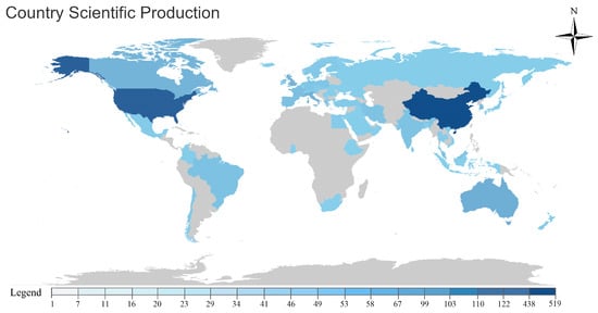 The inherent urban characteristics, marked by impervious surfaces combined with increasing anthropogenic activities, impose a significant adverse effect on urban hydrological administration. This impediment often hampers the large-scale incorporation of green infrastructure for effective stormwater regulation [54]. The interplay between green infrastructure and the hydrological environment has attracted increasing interest from academics and global policy designers. In the context of low-impact urban development, green roofs and walls serve as essential tools, providing sustainable, nature-aligned strategies for alleviating urban stormwater vulnerability. Through a precise screening process, the bibliometric analysis indicated an aggregation of 934 scholarly articles subject to hydrological research. As delineated in Figure 11, the preponderance of publication contributions originates from China (519), followed by the United States (438), Australia (122), Italy (110), the United Kingdom (103), and Canada (99).