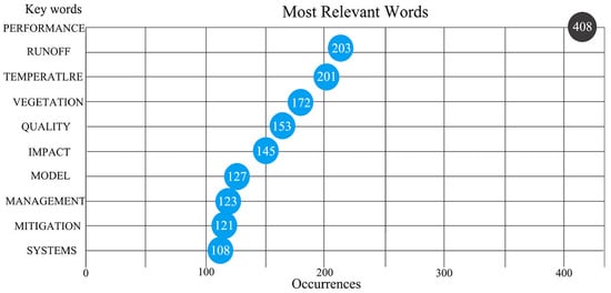 The directional comprehension of the evolution of skyrise greenery and its consequential effects on ecosystem services can be attained via an elementary bibliometric analysis. Nevertheless, a network structure evaluation can provide a more comprehensive understanding of the central research motifs and emergent tendencies in this research field. Employing the function of Bibliometrix R package for network structure analysis, word cloud visualizations and author keyword lists were generated, as illustrated in Figure 4 and Figure 5. By harmonizing the author keyword cloud depiction with the author keyword inventory, it is possible to discern the conspicuous research motifs within this realm. The keyword “performance”, recurring 408 times, was on the top list of skyrise greenery research. Most investigations revolve around the regulatory operations of ecosystem services, as exemplified by high-frequency keywords, such as “runoff” (203 instances), “temperature” (201 instances), and “quality” (153 instances).