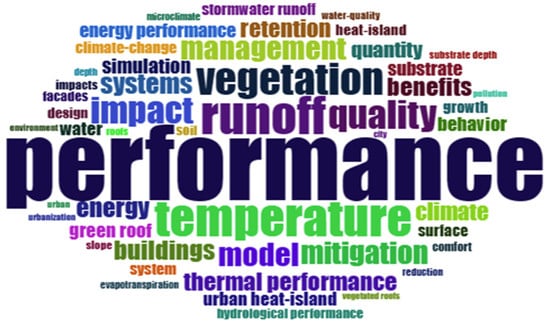 In light of climatic perturbations and urban ecological degradation, the paradigm of skyscraper greening anchored in the broader framework of urban green infrastructure has emerged as a focal point of contemporary environmental discourse [34]. The interpretative findings derived from an investigation utilizing Bibliometrix’s keyword cloud, word frequency enumeration, and “Co-Occurrence View of Keywords” through CiteSpace indicate the cardinal points of research interest. The primary green infrastructure is identified as green walls and green roofs, with a subsidiary emphasis on green facades and green buildings. Beyond the exploration of skyrise greenery, the research spectrum extends to assess hydrological performance, air quality, thermal performance, and biodiversity. Furthermore, the crux of the research content is largely dependent on parameters such as stormwater runoff, ambient temperature, plant selection, choice of construction materials, and the urban heat island phenomenon.
