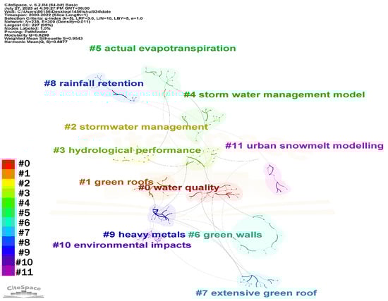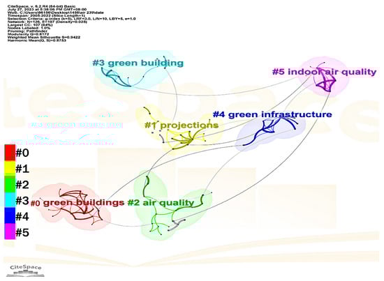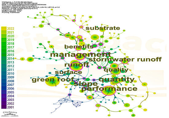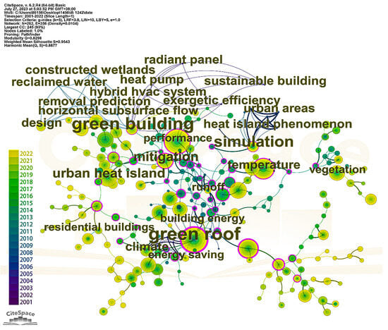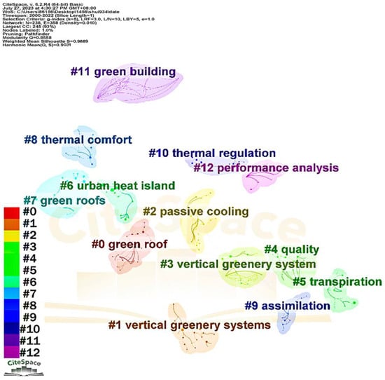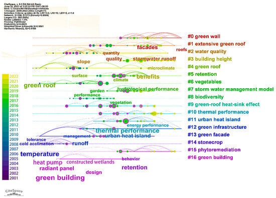 Keyword extraction and classification can unveil the research frontiers, dynamics, and tendencies in skyrise greenery research. Upon homogenizing several synonymous keywords, the “Co-Occurrence View of Keywords” attribute of CiteSpace 6.2 R4 was employed to analyze aggregating circumstances in skyrise greenery research. In the “Co-Occurrence View of Keywords” generated by CiteSpace 6.2 R4, nodes symbolize harvested keywords, and the size of the node typeface denotes their frequency. Lines interconnecting two keywords represent a co-occurrence, and the line thickness reflects the intensity of co-occurrence, while the line color denotes the inaugural co-occurrence instance of the keywords. Figure 6 presents the literature co-citation network associated with skyrise greenery. A total of 19 keywords are identified as high-frequency terms, such as green roofs, green buildings, facades, green walls, temperature, thermal performance, runoff, and quality, suggesting their close interrelation and consolidated research field. Figure 7 illustrates the time-series distribution of research hotspots. The cluster labels were automatically assigned, facilitating the genesis of 16 keyword clusters by CiteSpace 6.2 R4. The historical span of keywords exhibits the distribution of the initial occurrence and co-occurrences of keywords within a cluster and among clusters. Nodes denote keywords, while lines interlinking keywords symbolize a mutualistic relationship.