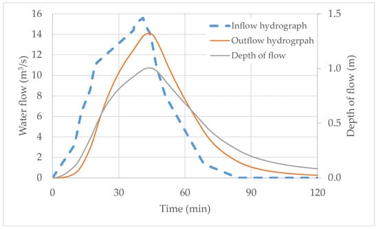 3/s, observed at 44.0 min, shifting by 3.5 min compared to the inflow hydrograph. Under these conditions, the outflow hydrograph lasts around 120 min, presenting a maximum flow depth of 1.00 m. The depth of the flow pattern aligns with the outflow hydrograph as these variables are interconnected.