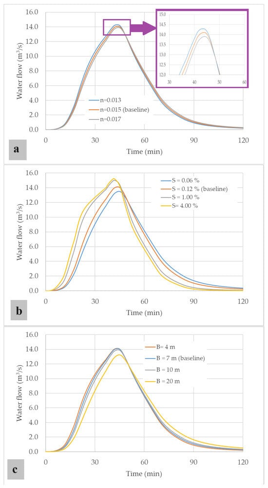 The width of the open channel varied from 4 to 20 m. Higher width values correspond to lower peak flow values. For instance, with a width () of 4 m, a peak flow value of 14.15 m3/s is observed, whereas with = 20 m, it decreases to 13.23 m3/s.