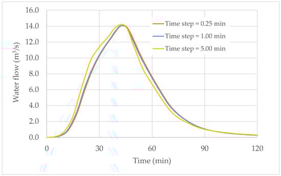 Section 3) and 1.00 min yields comparable peak flows and analogous water pulses. Conversely, a slight beat disparity emerges when a time step of 5 min is utilized. Notably, a maximum water flow of 13.99 m