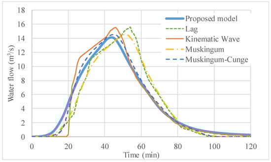 3/s occurring at 44 min. Across all simulations, the Kinematic Wave and Lag methods yield higher peak water flows than those predicted by the proposed model. It is essential to mention that the proposed model (a lumped routing method) provides values similar to those of the Muskingum–Cunge (a distributed routing method).