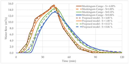 Figure 6b. Considering this, the results of the proposed model were contrasted with those of the Muskingum–Cunge method across bed slopes ranging from 0.06 to 4.0%.