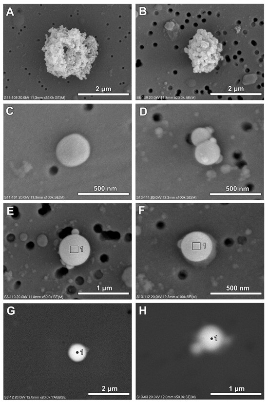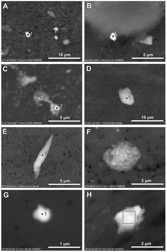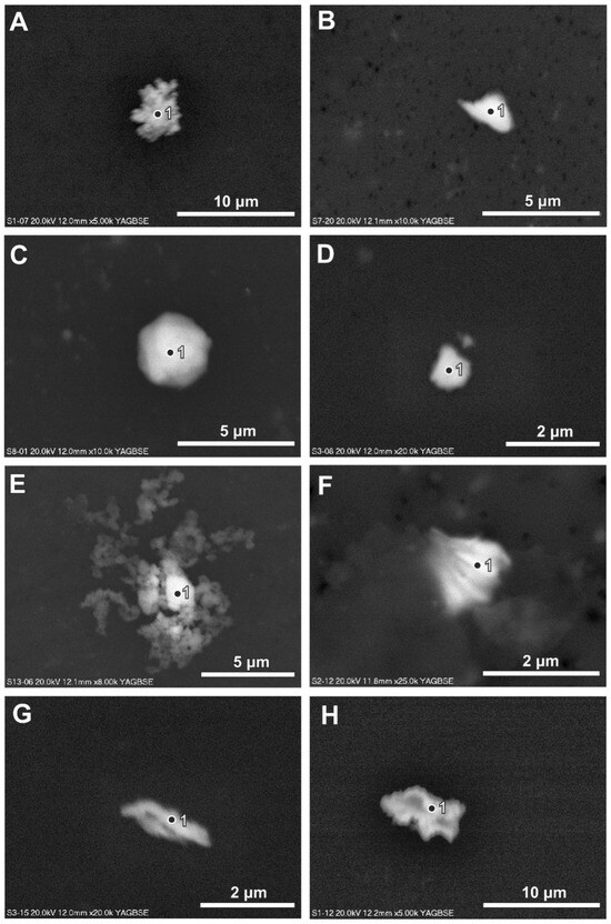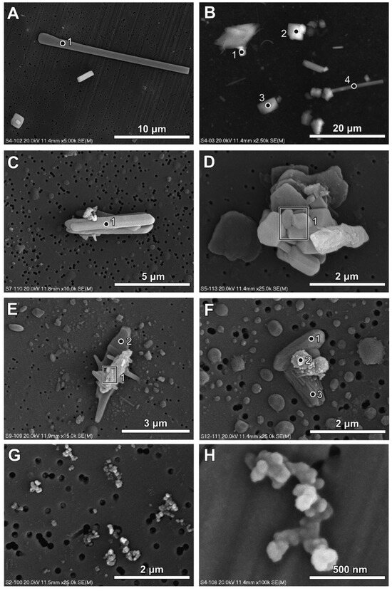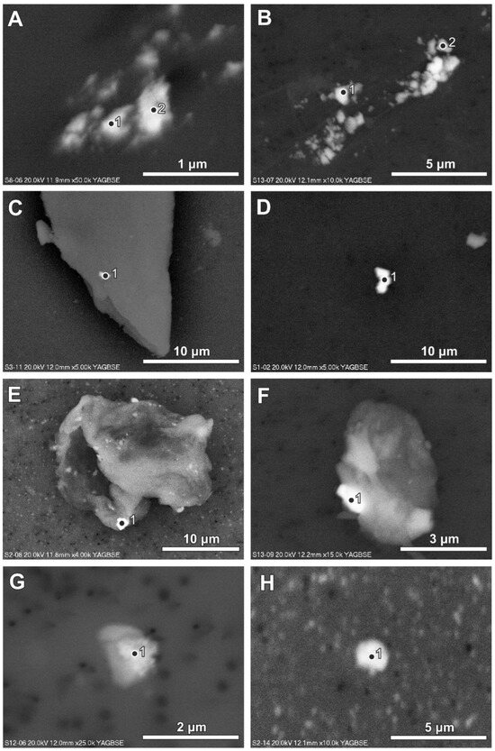 Aerosol particles (SEM; BSE images; chemical composition for indicated spots and areas—see Table 2; numbers correspond to spots listed in Table 2). (A–H) Fe-rich particles of irregular morphology ((C)—high content of S; (E)—high content of Zn; (F)—high content of Cr; (G,H)—high content of Cr and Ni).