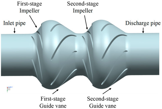 A multi-stage pump was designed using the software package CFturbo 9.2.5, and the three-dimensional (3D) model of the whole calculation domain was generated in the UG 11 platform. The numerical simulation solved the flows in all domains between the inlet and outlet of the pump. The assembly diagram of the fluid domain for the multi-stage pump model is shown in Figure 1. The hydraulic components are composed of an inlet pipe, two sets of centrifugal impellers and diffusers, and an outlet pipe. The basic design and main geometric parameters are presented in Table 1.