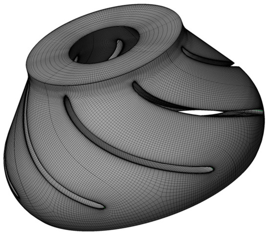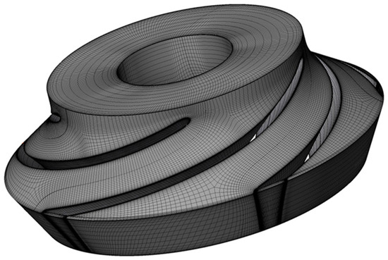 In order to solve the governing equation in the computational domain, the generation of mesh was conducted in ICEM 17.2 software to spatially discretize each calculation sub-region [33]. A hybrid mesh scheme was employed for the model discretization. Considering both the calculation accuracy and the computational resources, the structured mesh strategy was adopted for the impeller and diffuser, while the unstructured mesh was used for the rest of the parts. The impeller and diffuser are discretized from a hexahedral mesh structure. The flow channels near a single blade are meshed by using J/O type grid topology, and then the overall grid partitioning is achieved through the periodic array method. In order to ensure the calculation accuracy of turbulence, the mesh near the wall was refined. Figure 2 and Figure 3 display the generated meshes for the impeller and diffuser, respectively.