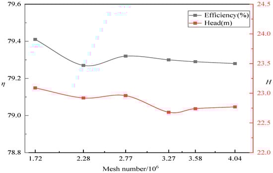An insufficient number of meshes may result in relatively low accuracy, while more computational resources are required due to an excessive number of meshes. In order to balance this confliction, the present study carried out the mesh independence analysis for the computational domain. The steady simulation under the rated flow condition was performed for the computational domain with the total mesh numbers of 1.72 million, 2.28 million, 2.77 million, 3.27 million, 3.58 million, and 4.04 million. The variations in the pump’s head and efficiency under different mesh numbers were obtained, as shown in Figure 4. The results show that, with the increase in the number of meshes, the efficiency fluctuates slightly. As for the change in head (or total pressure), it first decreases with the increase in the number of meshes to 3.27 million, and then goes up again slowly beyond 3.27 million meshes. Therefore, the total number of meshes for the calculation domain was eventually determined to be 3.58 million.