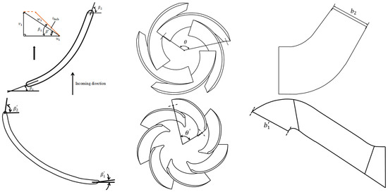 The design parameters of the diffuser have a significant impact on its matching with the impeller. Therefore, five main design parameters of the diffuser were selected as the initial optimization variables and included diffuser’s blade number Z, diffuser’s wrap angle θ′, diffuser’s inlet width b1′, diffuser’s inlet blade angle β1′, and diffuser’s outlet blade angle β2′. Meanwhile, four design parameters of the impeller were selected as variables to further consider the matching between diffuser and impeller: impeller’s outlet width b2, impeller’s inlet blade angle β1, impeller’s outlet blade angle β2, and impeller’s wrap angle θ. The selected design parameters are graphically shown in Figure 5.