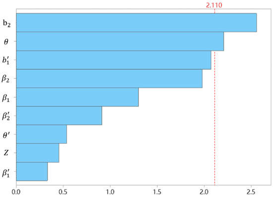 The 27 design scenarios obtained from the orthogonal experimental design were numerically calculated with focus on the hydraulic efficiency of the pump. Based on the simulation results, a regression equation, with efficiency as the evaluation index, was established. The normalized Pareto plot between the efficiency at design point and the 9 design parameters is shown in Figure 6, where the larger value denotes a greater correlation and more significant impact on the hydraulic efficiency of the pump.