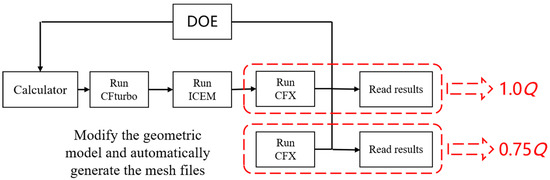 CFturbo, ICEM, CFD, and CFX were integrated through batch commands in the Insight platform. Then, an automatic numerical simulation procedure for optimizing the multi-stage centrifugal pump was built to ensure the accuracy and consistency of numerical simulation and shorten the optimization cycle. The multi-objective optimization function with the hydraulic efficiencies of 1.0 Qd and 0.75 Qd as the optimization objectives is calculated using Equation (1). The software integration framework is shown in Figure 7.