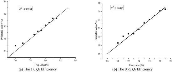 Based on the 56 sets of sampled data, RBF neural network was used to construct the nonlinear relationship between the optimization variables and the objective function. The input layer contained 4 neurons, while the output layer contained 2 neurons with 10 neurons used in the hidden layer. To test the fitting accuracy, 85% of the data was used to train the neural network and 15% of the data was adopted to conduct the regression analysis in terms of the coefficient of determination (R2). As can be seen from Figure 9, the R2 for the output was calculated to have the target values of greater than 0.95 at both 1.0 Qd and 0.75 Qd, indicating a high degree of agreement between the trained RBF neural network and the CFD calculations. This indicates that the model can accurately predict the nonlinear relationship between the hydraulic performance and the geometric parameters of the centrifugal pump.
