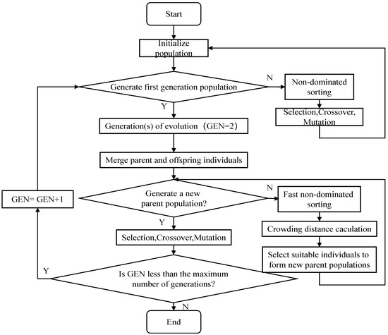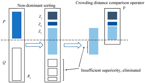 NSGA-Ⅱ, shown in Figure 10, is known as a fast non-dominant ranking genetic algorithm with elite retention strategy, and has been proposed based on the first generation of genetic algorithms [35]. Compared with the NSGA algorithm, the NSGA-Ⅱ has been improved in the following aspects.