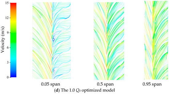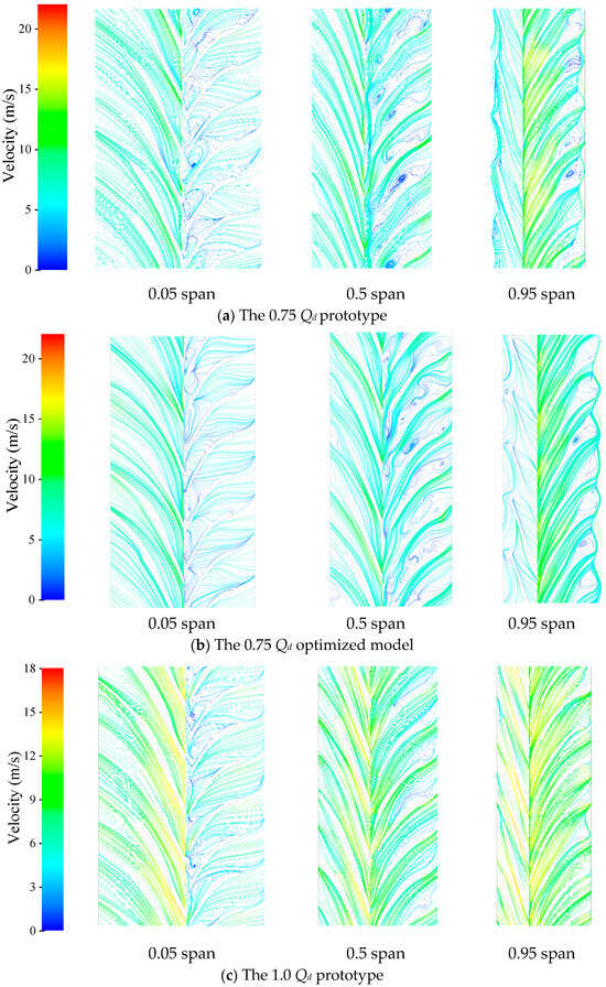The streamlines on the unfolded cross-section plane of the impeller and diffuser at three typical spanwise locations (span = 0.05, span = 0.5, and span = 0.95) before and after the optimization under two operating conditions are shown in Figure 12. The results showed that the streamlines in the impeller before and after the optimization were relatively uniform, while large-scale vortices were formed in the flow passage of the diffuser, leading to the highly non-uniform flow regimes and unwanted hydraulic losses. After the optimization, the vortices in the diffuser were basically eliminated and the flow pattern significantly improved to be smoother and more uniform, especially at the rated flow rate.