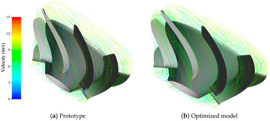 The 3D velocity streamlines before and after the optimization in the diffuser domain are shown in Figure 13. After optimization, the vortices in the diffuser flow passage were significantly weakened and the flow pattern improved to some degree.