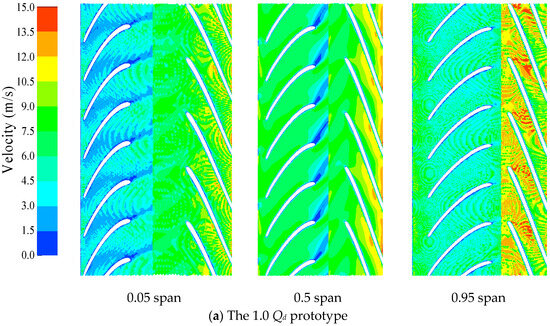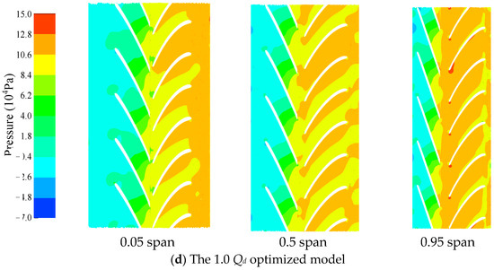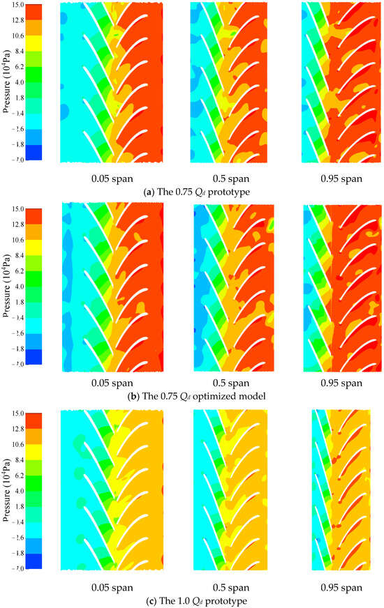 The pressure distribution at three typical spanwise locations (span = 0.05, span = 0.5, and span = 0.95) of the impeller and diffuser before and after the optimization under two operating conditions are shown in Figure 14. It is seen that the pressure gradually increased to show a stratified contour in the blade passage from the leading edge towards the trailing edge of the blade. Under the condition of 0.75 Qd, the pressure distribution is more uniform along the circumferential direction in the optimized model while the pressure is varied more obviously at the inlet of the impeller and the space between impeller and diffuser of the prototype. Under the condition of 1.0 Qd, low pressure regions were found at the leading edge of the impeller’s blade and high-pressure regions were seen at the suction side of the diffuser’s vane in the prototype, which may cause large pressure pulsation, reversed flow, and cavitation. However, these areas with extreme pressure were basically diminished in the optimized model, indicating an improved state of flow after the optimization. It should be noted that a negative value in pressure is the relative pressure referred to the reference pressure, i.e., 1 atm. Since the simulation of cavitation was not the research of interests in this work, the absolute pressure was not employed in the calculation.