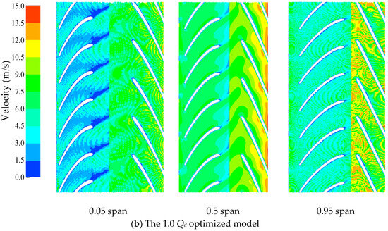 One of the key goals of this work is to optimize the internal flow at the interface between the diffusers of the first stage and the impeller’s blades of the second stage. Figure 15 shows the velocity field around the interface between the first stage and second stage at the nominal flow condition. Three typical spanwise locations are presented. It is very clear that the area and strength of wakes right after the outlet of the diffusers are weakened in the optimized model at the position of 0.5 span where the bulk flow moves through. In the optimized model at 0.5 span, the flow leaving from the outlets of the diffusers in the first stage can effectively attach the leading edge of the impeller’s blades in the second stage. It is seen that there is no significant flow separation at the pressure side of the impeller’s blades. The improved flow field indicates that the optimization on the geometrical parameters achieves a better match at the interface between two stages and increases the hydraulic efficiency at the nominal flow rate.