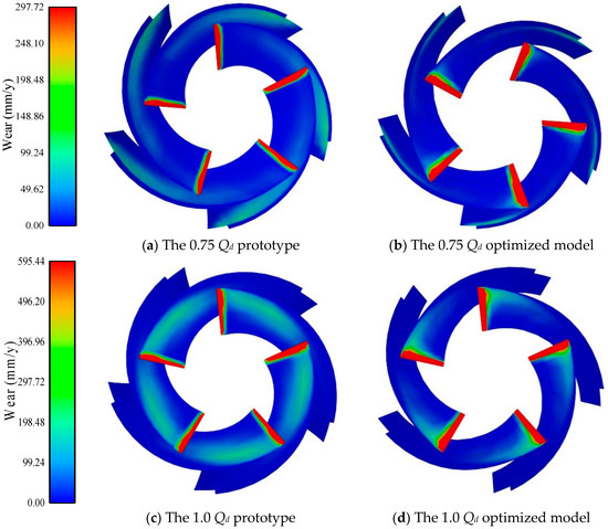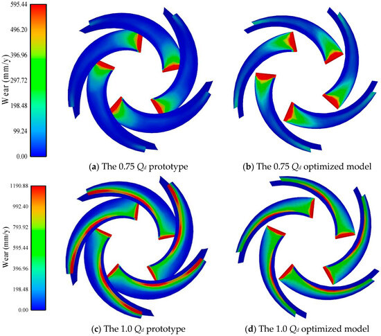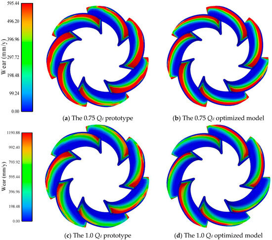 According to the contours of the predicted wear distribution on the impeller blades of first stage (Figure 16), the wear mainly occurred at the blade inlets and blade outlets and at the junction of the working surfaces with the back shroud. The most severe wear occurred at the leading edge because there were fierce collisions between the particles and the blade head with high circumferential velocity. The annual wear at the blade head exceeded 3000 mm/y. Under the condition of 0.75 Qd, the wear mainly occurred in the posterior region after the blade inlet, reaching 50 mm/y. When the flow rate increased from 0.75 Qd to 1.0 Qd, the wear extended towards the middle portion of the working surface, exceeding 150 mm/y. The wear at the trailing edge significantly increased, with an annual wear exceeding 300 mm/y. By comparing Figure 16c,d, it is evident that the distribution of wear in the optimized model was more uniform than in the prototype. Moreover, the wear at the trailing edge of the blades was notably reduced, with an annual wear rate not exceeding the value of 150 mm/y. This improvement is attributed to the optimization on the geometrical parameters of the impeller blade outlet.