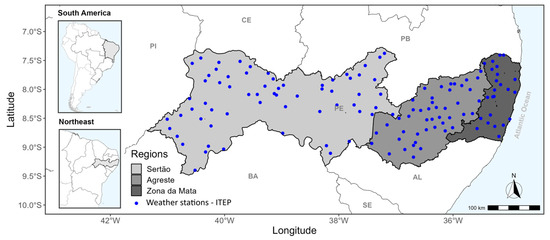 Pernambuco is divided into three major regions: Sertão, Agreste, and Zona da Mata, as shown in Figure 1, which also illustrates the spatial arrangement (blue dots) of the weather stations considered for analysis. As the state is bathed in the Atlantic Ocean, the climate near its coast (Zona da Mata) is tropical and humid. However, as one moves longitudinally within the state (from Zona da Mata crossing Agreste in the direction of Sertão), the climate becomes dry. This is because about 80% of its territory (which includes Sertão and Agreste) is located in a region with a semi-arid climate where rainfall is scarce and poorly distributed, causing frequent drought events [54].