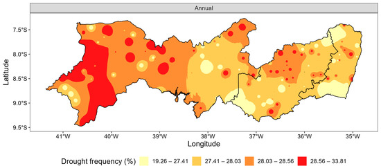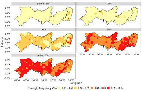 Spatial distribution of drought frequency on an annual scale (SPI-12) in the state of Pernambuco over five decades between 1962 and 2012. Frequency ranges were generated by the k-means method [90].