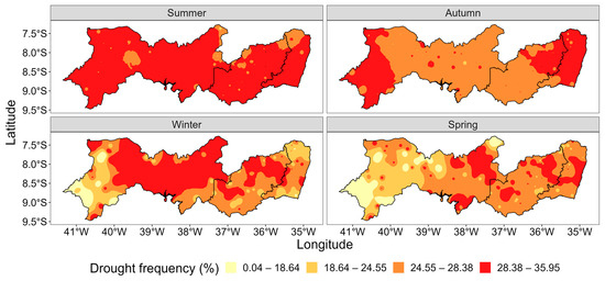 The drought frequency distributions on a seasonal scale (obtained from the SPI-3 values) are presented in Figure 3, for summer (December–February), autumn (March–May), winter (June–August), and spring (September–November). Here, the k-means clustering method [90] was used again to divide the range between the maximum and minimum values of the drought frequency into four intervals. During the summer, Pernambuco experienced high drought frequencies in practically its entire territory, with percentages that varied between 24.55% and 35.95%, achieving an average of 29.93%. During autumn, higher frequencies were observed in the extremes of Pernambuco (west of the Sertão, east of the Agreste, and in almost the entire Zona da Mata), and the percentages varied between 24.18% and 34.64%, with an average of 29.52%; while, during the winter, there was a higher frequency of droughts in the central region of the Sertão, with variation between 17.64% and 34.64% and a mean value of 25.29%. During spring, the frequency of drought varied between 22.22% and 35.29% (with an average of 27.53%), and most of the territory exhibited lower drought frequencies in comparison to the other seasons.