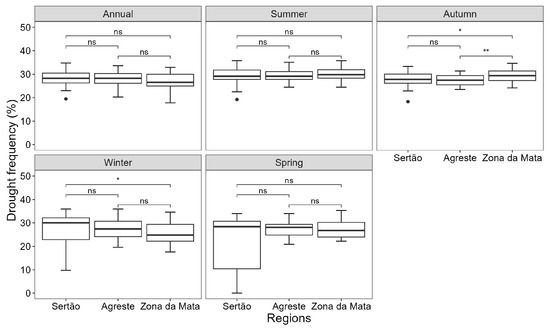 Drought frequency (%) boxplots for each region for annual and seasonal scales. The symbols “*” (), and “**” () indicate that there is a significant difference based on the Wilcoxon–Mann–Whitney test [91]. “ns”: non-significant.