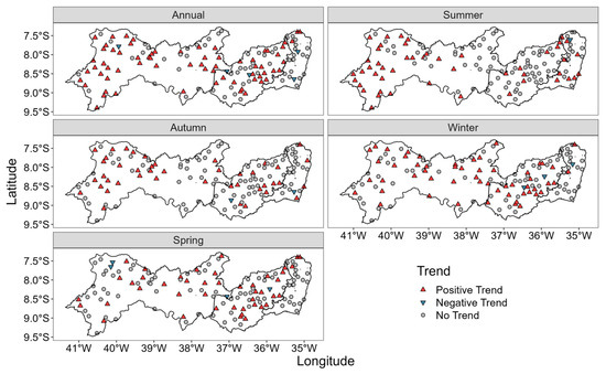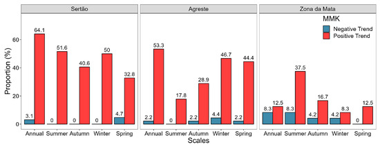 The proportion of weather stations with significant trends, calculated by region (Sertão, Agreste, and Zona da Mata) on annual and seasonal scales, is illustrated in Figure 7, where red bars represent the percentage of positive significant trends and blue bars represent negative significant trends. The results show that Sertão was the region with the highest proportion of stations, with positive trends for all scales. The fact that this region is getting drier has also been noted by Assis et al. [92] and Silva and Azevedo [93].