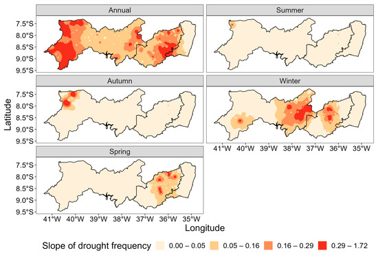 The spatial distribution of trend magnitude (Sen’s slope values interpolated across Pernambuco state) in drought frequency on annual (SPI-12) and seasonal (SPI-3) scales is presented in Figure 8. On an annual scale, the trend magnitude showed to be more expressive in western Pernambuco, a region heavily impacted by drought events [52], and eastern Agreste. On a seasonal scale, one observes the highest values of trend magnitude in northwest Pernambuco during summer and autumn and in the Agreste region (center and north) during the spring and winter. In addition, the trend’s magnitudes showed to be more expressive in the eastern part of the Sertão during winter.
