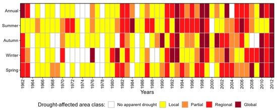 Results obtained for the drought-affected area (station proportion, in percentage) on an annual (SPI-12) and seasonal (SPI-3) scale are presented in Figure 9 according to the coverage area class (no apparent drought, local, partial, regional, and global). Global coverage of droughts at all scales has become more frequent since 1990, a period in which the Brazilian Northeast was severely impacted by droughts [35]. On an annual scale, the drought-affected area varied from 1.38% (no apparent drought) to 90.10% (global), with an average of 28.50% (partial regional drought). On a seasonal scale, the drought-affected area values range from 7.52% (no apparent drought) to 67.40% (global drought) in summer, 0% (no apparent drought) to 96% (global drought) in autumn, 2.51% (no apparent drought) to 76.20% (global drought) in winter, and 4.01% (no apparent drought) to 57.60% (global drought) in spring, with an average of 29.40% (partial regional drought), 28% (partial regional drought), 26.90% (partial regional drought), and 25.5% (partial regional drought), respectively.