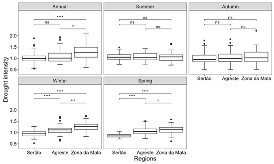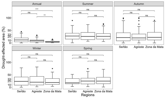 Drought-affected area (%) boxplots for each region (Sertão, Agreste, and Zona da Mata) for annual and seasonal scales. The symbols “**” () and “***” () indicate that there is a significant difference based on the Wilcoxon–Mann–Whitney test [91]. “ns”—non-significant.