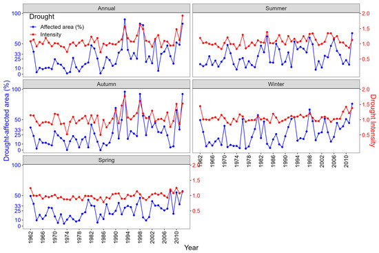 The SPI (annual and seasonal) and its derived drought frequency, affected area, and drought intensity were calculated using R environment [62].