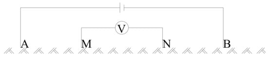The mine 3D DC resistivity method uses DC to detect the resistivity of a medium. Its basic principle is the same as that of the resistance testing method in physics. By supplying a stable current to a circuit, the potential V and current I are measured on both sides of the resistance R. The resistance law can be used to calculate the resistivity of the resistance in the circuit. The DC resistivity law uses the earth as the conductive medium for detection. To form a DC circuit, the power supply needs to be directly connected to the earth through a wire, as shown in Figure 1 []. In Figure 1, A and B are the power supply electrodes connected to the power source and the earth medium, respectively, while M and N are the potential electrodes, which are mainly used to measure the potential difference between M and N, also known as the receiving electrode.