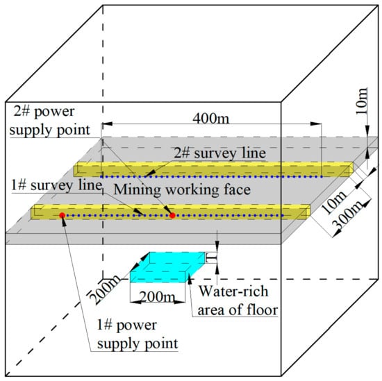 Due to the fact that the designed model included coal seams, water-rich areas, and roadways, analytical formulas could not be used to calculate the potential of each measurement point. Therefore, we used the full-space three-dimensional electrical finite element method [] for numerical calculations. The detailed algorithm will not be elaborated on here.