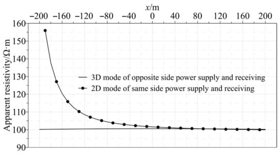 To provide an explanatory basis for the measured data, first, we analyzed the characteristics of the apparent resistivity in the presence of only coal seams and tunnels without anomalies, as shown in Figure 4. The horizontal axis represents the positions of the measurement points along the direction of the roadway, and the vertical axis represents the apparent resistivity calculated using Equation (1). When power was supplied and received on the same side (Point #1 was powered, measurement Line #1 received, and the power supply point was located at the x = −200 m position), as the distance from the power supply point increased, the apparent resistivity gradually decreased and tended to reach the roof’s or floor’s resistivity of 100 Ω·m. This was mainly caused by the depth of detection determined by the DC resistivity method and the distance between the electrodes. The potential near the power supply point was mainly affected by the coal seam and the roadway, while the potential far from the power supply point was mainly influenced by the electrical properties of the roof’s and floor’s rock layers. The apparent resistivity of the 3D observation mode (powered by Point #2 and received by Line #2) was approximately 100 Ω·m, mainly because the minimum distance between the source of emission (Point #2) and Line #2 was 300 m, which could not effectively reflect the electrical information of shallow coal seams and roadways.