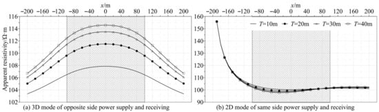 Figure 5b shows the apparent resistivity curves calculated by the 2D mode with same-side power supply and reception. As the distance from the power supply point (x = −200 m) increased, the apparent resistivity first decreased, then increased, then decreased, and finally approached the background resistivity. That is, the resistivity at the abnormal corresponding position close to the power supply point was lower than the background resistivity, and the resistivity at the anomaly far from the power supply point was greater than the background value. As the thickness of the water-rich zone decreased, the apparent resistivity gradually tended toward the background value.
