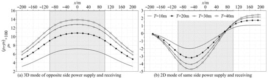 The apparent resistivity curves could analyze only the impact of different grouting states on the observation data and could not analyze their degree of influence. Therefore, the detection ability of 2D and 3D observation modes was analyzed on the basis of the rate of change in the apparent resistivity. The curves of the rate of change in apparent resistivity are shown in Figure 6. The vertical axis in the figure represents the calculation formula for the rate of change in apparent resistivity, where ρ a is the apparent resistivity calculated by the models with different grouting states in the water-rich zone in Figure 5, and ρ b is the background’s apparent resistivity calculated by the model without water-rich zones in Figure 4. Figure 6a shows the curves of the rate of change in the apparent resistivity obtained from the 3D observation mode with opposite-side power supply and reception. The rate of change in apparent resistivity ranged from 3% to 14%, and the rate of change in apparent resistivity of all models had a part that was greater than 5%. Due to the influence of free current and errors in the electrodes’ position during actual construction, observation data usually contain 3% to 5% random noise []. Therefore, the 3D mode with opposite-side power supply and reception could effectively detect water-rich areas with thicknesses greater than 10 m. Figure 6b shows the curves of the rate of change in the apparent resistivity obtained from the 2D observation mode with same-side power supply and reception, with the rate of change in apparent resistivity ranging from −5% to 3%. Regardless of the thickness of the water-rich area, in these models, no areas with rates of change in apparent resistivity were greater than 5%, indicating that the 2D observation model could not effectively detect the water-rich area of the size set in this article.