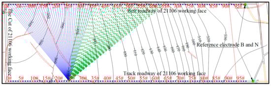 During the initial exploration and secondary exploration, a total of 99 electrode points were laid along the track roadway of Working Face 21106, and 98 electrode points were laid along the belt roadway. The electrodes’ spacing was 10 m, and a positive power supply electrode was supplied every 50 m. In Figure 8, the red circles represent the power supply points, and the blue circles represent the receiving points. Due to the limited number of the instrument’s channels, only 36 channels of data, or 350 m, could be received in one transmission. As shown in Figure 8, the power supply was provided at Point #25 of the track roadway, and the receivers were located at Points #0–35 of the belt roadway. In addition, the electrodes at Positions #0–35 received the potential generated by the power supply electrodes at Points #0, #5… #40 in the track roadway. After the power supply was completed at Point #40 of the corresponding track roadway for Points #0–#35 of the belt roadway, the receiving cable of the belt roadway moved to Points #30–#65, corresponding to the electrodes at Points #25, #30… #70 in the track roadway, and power was supplied. Each time the cable moved 300 m, the process was repeated to analyze the stability of the data.