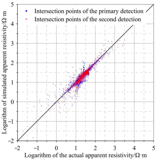 The blue dots in the figure are the intersection points of the initial exploration, and the red dots are the intersection points of the secondary exploration. When the intersection point completely coincides with the black solid line in the figure, the measured data are consistent with the inverted data. Due to the influence of free current and displacement of the electrodes in the roadway during actual work, there was some interference with the measured data. It is difficult for the results of inversion to be completely consistent with the measured data. When the intersection point between the measured value and the inversion simulation value is roughly on the diagonal of the diagram, the results of inversion can be considered to be reliable. As shown in the figure, the intersection points between the initial exploration and secondary exploration are roughly located on the diagonal, indicating that the inverted results of the initial exploration and secondary exploration are relatively reliable, and that the results of the inversion model can accurately represent the geological situation of the working face’s floor.