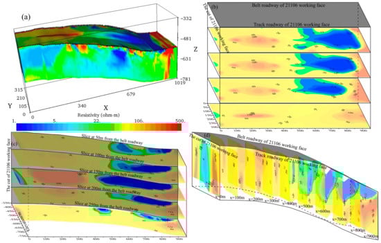 Figure 10c shows the x–z plane profiles at distances of 50 m, 100 m, 150 m, 200 m, and 250 m from the belt roadway in the volume of the 3D resistivity inversion data. Figure 10d shows the y–z plane profiles extracted from the volume of the 3D resistivity inversion data at distances of 0 m, 50 m, 100 m, and 150–900 m from the setup room. According to Figure 10b,c, the center of the anomaly is located 40–60 m below the coal seam. According to the drilling data provided by the Xinqiao Coal Mine, the low-resistivity anomaly at the setup room is caused by the accumulation of water in the floor. The water inflow from the drilling hole within a range of 450–900 m from the setup room reaches 128 m3/h, which is caused by the water content in the large-scale cracks of the Taiyuan Formation limestone on the floor of the mine’s working face.