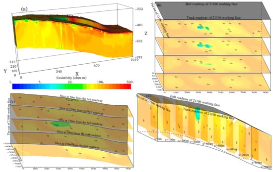 Figure 10. Inverted results of the initial exploration of the mine 3D DC resistivity method. (a) The volume of the 3D resistivity inversion data; (b) x-y plane profiles at different distances from the bottom of working face 21106; (c) x-z plane profiles at different distances from the belt roadway; (d) y-z plane profiles at different distances from the cut of working face 21106.