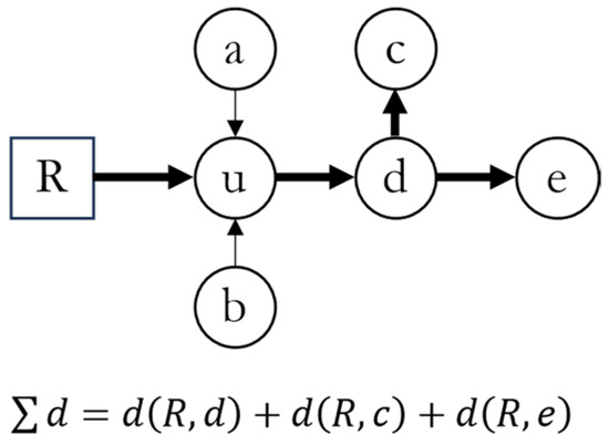 To capture the behavior of a WDN, the pipe direction must be considered. A single node in a WDN is not always connected to every other node in the network, and because of the pipe flow, each node has a set of reachable nodes. Adapting the concept of demand centrality from Zarghami and Gunawan [26], the centrality of node should be reduced to the shortest path between the source and demand nodes that contain node , as shown in Figure 2 (the shortest paths are highlighted with bold lines).