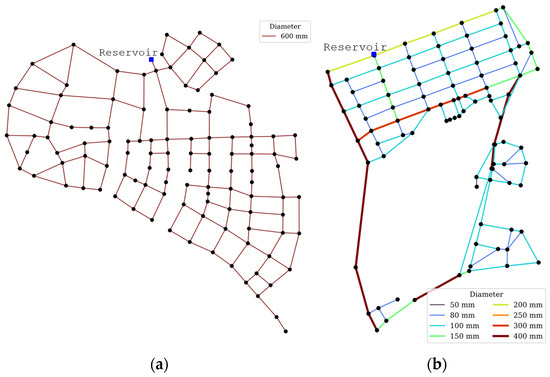 Calculations and modeling were performed using Python 3 [28] and the water network tool for resilience (WNTR) 1.1.0 Python package [29]. The HCC was applied to two WDNs: the ZhiJiang network [30] and a network cut set in South Korea, IH61. For simplicity, both are referred to as Net-A and Net-B, respectively. The details of the networks are shown in Figure 3, and Table 1 lists the network characteristics.