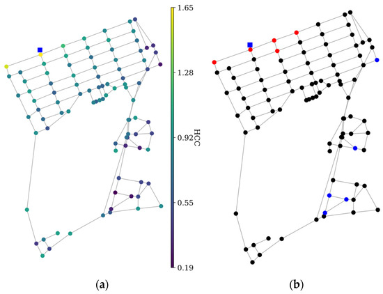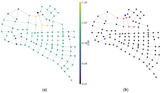 Weights were assigned to the pipes of both networks based on the nodal demand and flow in the pipes. The HCC values served as a comparison of the criticality between nodes in the network. Following the calculation, the results are presented in Figure 4 and Figure 5 for the comparison of HCC values between nodes and the top and bottom 5% percentile locations (indicated by red and blue markers, respectively).