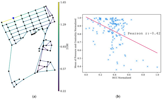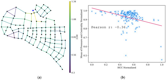 A common issue in WDNs is pipe breakage, which affects network pressure and connectivity. To assess whether locations with high HCC can be related to a loss of quality of service, several pipe breakage scenarios were simulated. Before conducting the simulation, the link HCC was calculated by averaging the nodal HCC values tied to each pipe. Each simulation entailed sequentially closing individual pipes and calculating the resulting mean network pressure and closeness centrality. Pressure and centrality were normalized, averaged, and compared with the normalized HCC values. Pearson’s correlation test was used to determine correlations. In this simulation, the disconnection of pipes that caused the isolation of the network (bridge connections) was not conducted. The results are shown in Figure 6 and Figure 7.