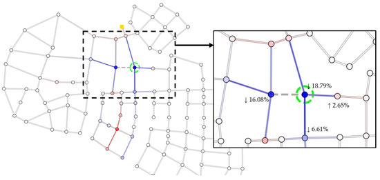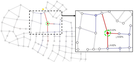 Pipe flow in the network drives the HCC value. Urban development, such as an increase in population, increases the demand in the network, changing the current flow profile. It is crucial for management to know what types of changes will occur in the network and plan accordingly. The impact of the development scenarios can be simulated using HCC. By examining the before-and-after HCC values, actions can be taken to ensure sustainable management. A population increase scenario was tested on Net-A, where 10% water demand was increased in one of the most critical nodes (green circled stripes in the figure), as shown in Figure 8 (HCC increase is in red, and HCC decrease is depicted in blue).