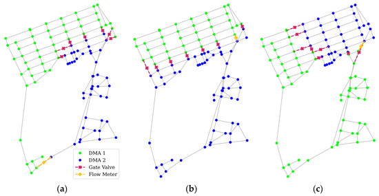 A DMA in a WDN is an isolated section that can be monitored and controlled separately. The creation of a DMA can promote pressure control, making it more uniform and reducing leakage. Net-B was used for this demonstration, and the DMA creation method employed a community structure algorithm [31] for group nodes with similar characteristics. Three different factors were used for DMA clustering: HCC, nodal pressure, and node elevation. The three configurations were then compared using multicriteria decision analysis (MCDA) and weighting: (1) Todini’s resilience index [32], (2) pressure uniformity (PU) index [33] as the hydraulic indices, and (3) centrality as the connectivity index (MCDA weight = [0.3, 0.3, 0.4]). The weighting was decided based on the objective of the research, which was to combine hydraulic and connectivity factors. The hydraulic aspect especially considers the importance of network robustness and leakage reduction. Hence, it was decided to use two hydraulic factors with lower weighting compared to the connectivity factor. The three configurations of the DMA separation are presented in Figure 10, and Table 2 lists the normalized MCDA results.