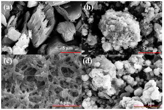 SEM images of (a) MXene, (b) CuFeS2/MXene, (c) PVDF membrane, and (d) CuFeS2/MXene–PVDF membrane.
